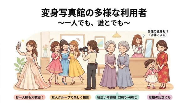 一人で来ている方もいますし、台湾に住んでいる親子がお嬢さんの変身写真を撮りに来ていたこともありました。お店によっては男性が女性に変身して撮影できるところもあります。