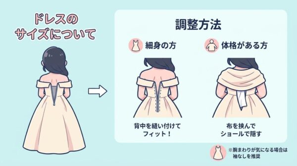 - 体格がある方:背中のファスナーが閉まらない部分に布を挟んで縫い付け、ショールで隠してくれます。