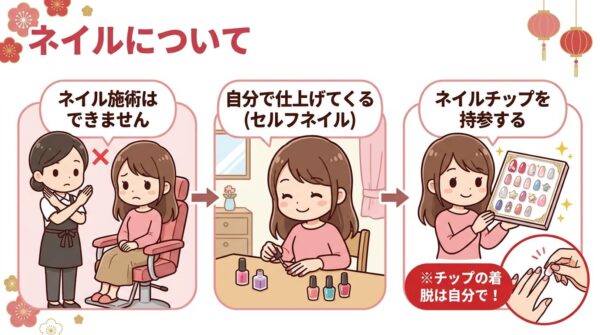 一点だけ注意があります。ネイルはやってもらえません。(店による)