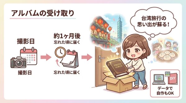完成したアルバムが届くのは撮影から約1ヶ月後です(夢工場の場合)。結構忘れた頃に届きますので、受け取ったときに台湾旅行をあらためて思い出す感じになります。