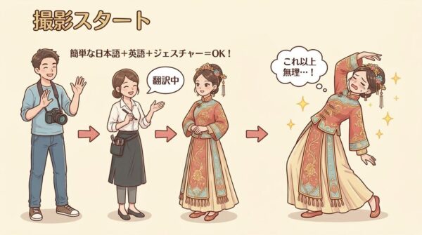 この店舗は男性のカメラマンが担当してくれました。複雑な日本語でのやりとりは少し難しいですが、簡単な日本語と英語とジェスチャーで何とかなります。