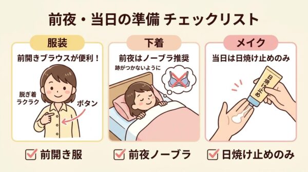 服装はトップスが前開き(ボタン付き)のブラウスだと便利です。