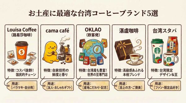 お土産には、手軽な「Louisa Coffee」のドリップバッグや、高級感のある「湛盧咖啡」のギフトセットなどが特におすすめです。