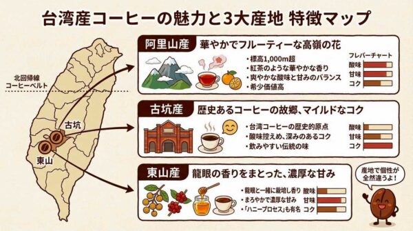 台湾産のコーヒーは、阿里山や古坑といった有名な産地ごとに異なる個性的な味わいを楽しめるのが大きな魅力です。