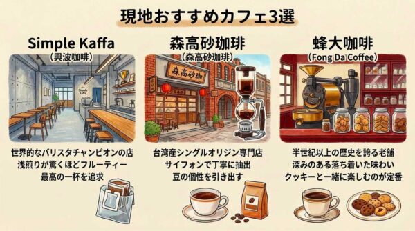 現地で「Simple Kaffa」や「森高砂珈琲」などの人気カフェを巡りながら、自分だけのお気に入りの一杯を見つけてみてください。