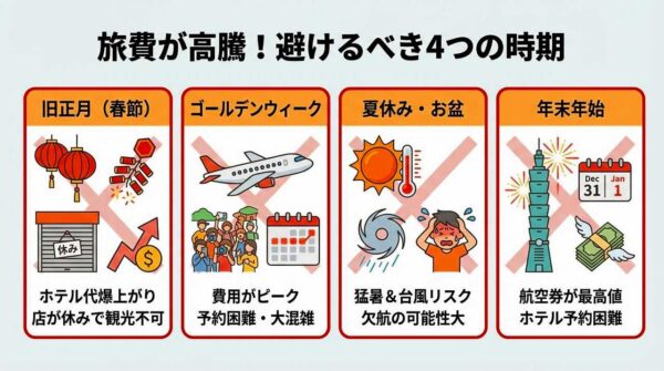 「安い時期」を最優先にするのであれば、旧正月の前後2週間は候補から外しておくのが無難な選択と言えるでしょう。