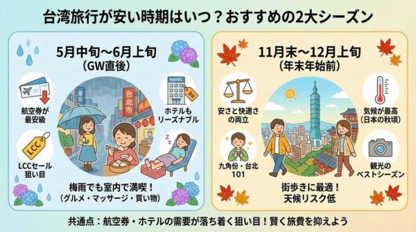 11月末から12月上旬にかけては、台湾旅行において「安さ」と「快適さ」を両立できる最高の穴場シーズンです。