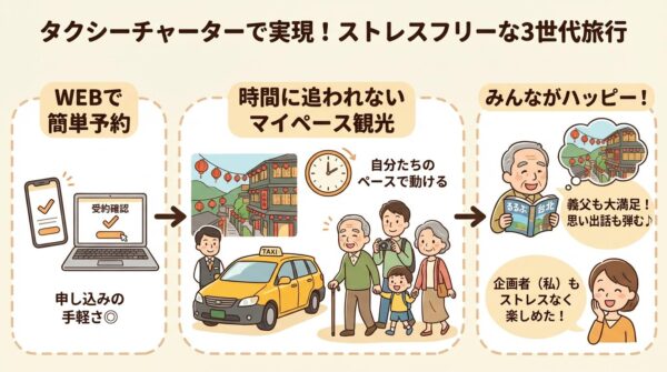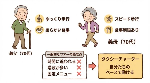 ツアーを調べていると、同じ会社でタクシーチャーター(貸し切り)もやっていることがわかりました。これなら義両親の希望に沿えます!