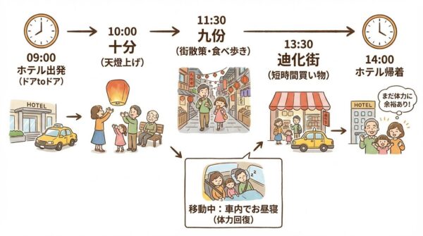 - 基本ルート:十分(天燈上げ)→ 九份(街並み散策)→ ホテル
