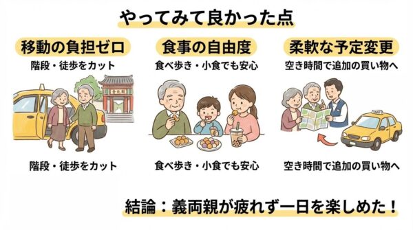 義両親が疲れず、時間に追われることなく自由に行動できたのは本当に良かったですよ。その一部をご紹介しますね。